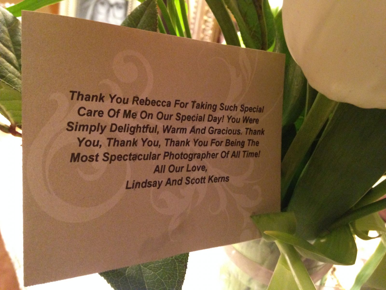 This note card arived with a beautiful arrangement of flowers from Lindsay and Scott Kerns as a "Thank you" to Rebecca Hahn for being their wedding photographer this past June 2015.